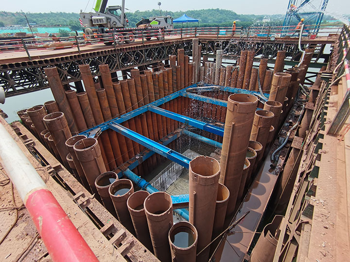 蟠龍大橋主橋涉水施工措施是技術(shù)難點、重要性節(jié)點、施工危險性較大工程之一,主要技術(shù)難點在于水中墩柱承臺的圍堰施工,針對薄覆蓋層硬質(zhì)河床、承臺入巖等水文地質(zhì)、設(shè)計要求,工程管理公司黨總支在蟠龍大橋項目成立黨員先鋒隊攻堅小組,精心組織、知難而上、勇于探索,在水中P17#、P18#墩采用了“成套鎖扣鋼管樁(φ630)+全套管全回轉(zhuǎn)鉆引孔開槽+清槽嵌固+封底”的圍堰方案,成功破解了項目建設(shè)中,水中薄覆蓋層硬質(zhì)河床引孔開槽、鋼管樁搭設(shè)鎖扣、反循環(huán)清槽、細(xì)石混凝土封槽、鎖扣止水等技術(shù)難點。
