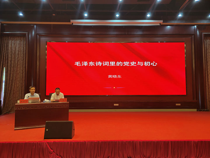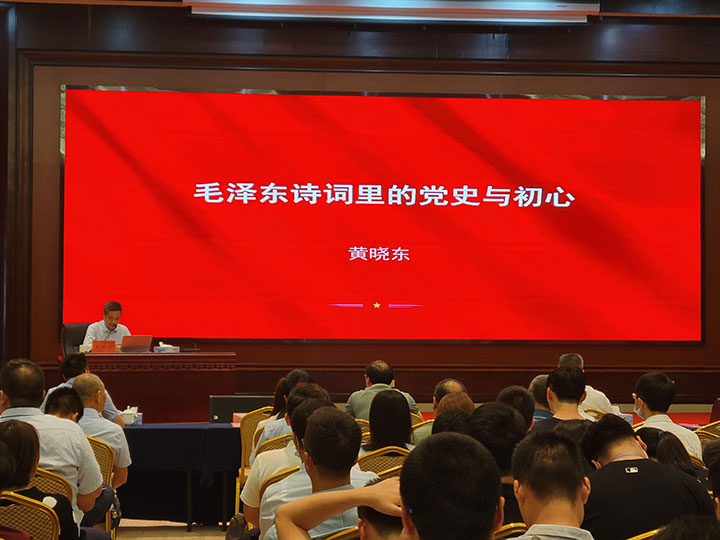 黃曉東同志以《毛澤東詩詞里的黨史與初心》為主題,以毛澤東同志的革命道路為主線,品讀毛澤東同志不同時期的詩詞,從離愁別恨里的黨史與初心等10個方面,回溯偉人立志報國救亡、書生意氣的青年時代、艱苦卓絕的革命崢嶸歲月、如火如荼的社會主義革命和建設(shè)歷程,彰顯偉人獨具魅力的個性情懷和豪邁氣概,闡述了共產(chǎn)黨人的初心與使命。