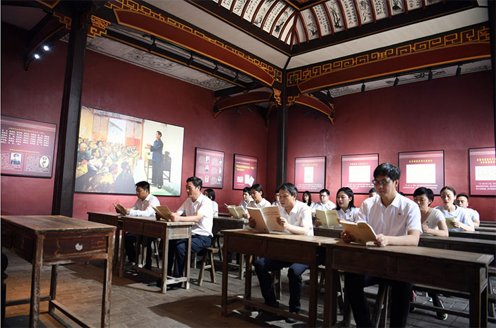 在興國縣蘇維埃政府所在地——瀲江書院,毛主席在這里舉辦了興國縣土地革命干部訓練班,為中央蘇區(qū)的土地革命培養(yǎng)了第一批斗爭骨干,建立了興國縣第一個革命政權(quán)。大家在土地革命干部訓練班舊址學堂內(nèi),集體誦讀了一段土地革命時期的歷史,當朗朗書聲再次在書院響起,珍貴的革命記憶浮于腦海,激勵黨員們延續(xù)紅色根脈、傳承紅色基因。