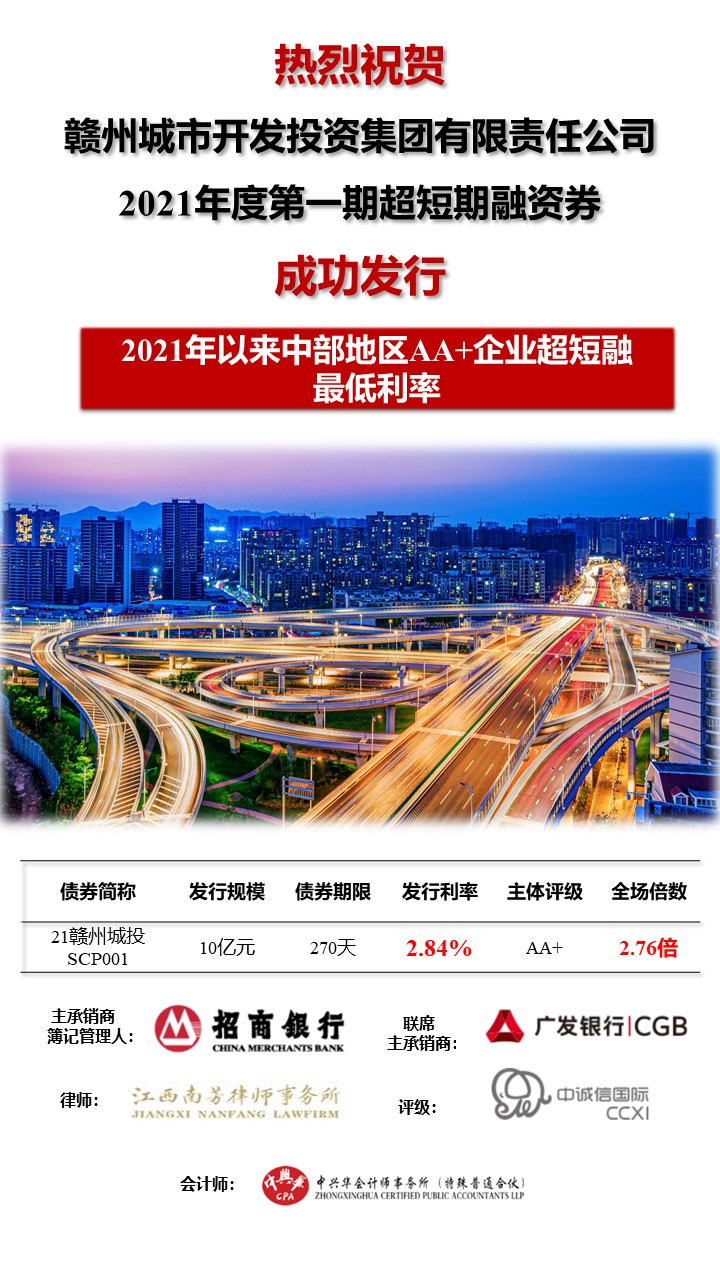 近日,贛州城投集團(tuán)2021年度第一期超短期融資券(SCP001)在銀行間債券市場(chǎng)成功發(fā)行,金額10億元、票面利率2.84%、發(fā)行期限270天,全場(chǎng)認(rèn)購(gòu)倍數(shù)2.76倍,創(chuàng)2021年以來(lái)中部地區(qū)AA+企業(yè)超短融最低利率。