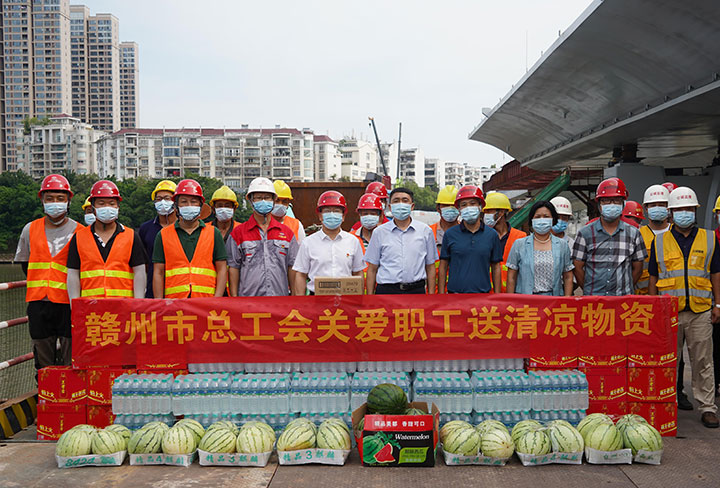 為鞏固解困脫困工作成果,提高職工生活品質(zhì),使高溫下作業(yè)的一線職工有更多的獲得感、幸福感、安全感,8月25日,贛州市總工會二級調(diào)研員賴定銘一行來到贛州城投集團南河大橋拓寬改造(二期)工程項目工地開展“關愛職工 夏送清涼”走訪慰問活動,送上市總工會的關懷。贛州城投集團黨委副書記黃家偉,工程管理公司相關負責人,集團工會、文化宣傳部、項目部業(yè)主、監(jiān)理和施工單位相關人員等參加慰問。