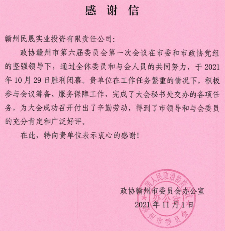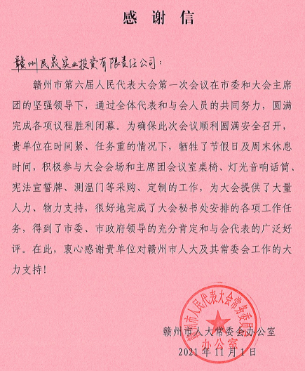 這次圓滿完成市“兩會(huì)”會(huì)務(wù)保障工作,并獲得市人大、市政協(xié)感謝信表?yè)P(yáng),是對(duì)集團(tuán)上下講政治、講擔(dān)當(dāng)、講大局的認(rèn)可與褒獎(jiǎng)。第三屆世界贛商大會(huì)召開(kāi)在即,大會(huì)開(kāi)幕式將在贛州大劇院舉辦,民晟實(shí)業(yè)公司等相關(guān)單位將再接再厲,熱情服務(wù)好各界賓朋,充分展示新時(shí)代國(guó)企的擔(dān)當(dāng)作為。