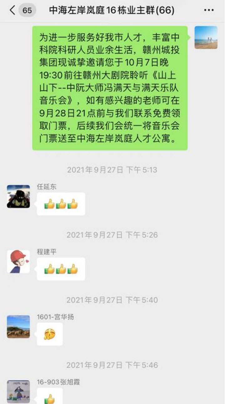 9月17日,支部書記帶隊(duì)再次到人才公寓走訪,了解到科研人員平時(shí)忙碌、業(yè)余文化生活不豐富,大部分科研人員中秋國(guó)慶期間因離家較遠(yuǎn)和疫情防控將留贛。為滿足人才精神文化需求,民晟實(shí)業(yè)公司聯(lián)合贛州市保利劇院管理有限公司,在“文化惠民”政策下,邀請(qǐng)留贛科研人員在贛州大劇院免費(fèi)聆聽“山上山下”中阮演奏音樂會(huì),黨員先鋒隊(duì)成員還專程送公益票上門。消息一經(jīng)人才公寓業(yè)主群發(fā)出,反響熱烈,獲得科研人員頻頻“點(diǎn)贊”。“感謝你們的關(guān)心關(guān)懷和貼心服務(wù),讓我們國(guó)慶留贛能聽一場(chǎng)名家現(xiàn)場(chǎng)音樂會(huì)!”領(lǐng)票現(xiàn)場(chǎng),一位科研人員說道。