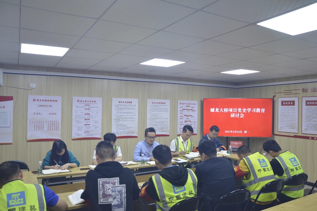 在蟠龍大橋項目,黨史學(xué)習(xí)教育活動已常態(tài)化開展。在辦公區(qū)、施工現(xiàn)場掛起了一抹抹醒目的黨史學(xué)習(xí)宣傳標語,在黨員活動室走廊設(shè)置了黨史學(xué)習(xí)墻。在每月首個工作日,項目部組織全體黨員及項目人員組織升旗活動,并開展國旗下的黨史故事誦讀活動。同時,組織觀看微紀錄片《見證初心和使命的“十一書”》,重溫革命先烈的感人故事,感悟初心使命,弘揚革命精神,為高質(zhì)量推動項目建設(shè)積極奮斗。
