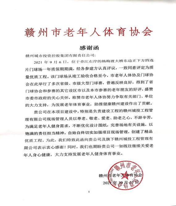 近日,贛州市老年人體育協(xié)會向贛州城投集團(tuán)送來了一封感謝信,信中對贛州城投集團(tuán)及下屬工程管理公司關(guān)心關(guān)愛老年人身體健康,大力支持老年人健身體育事業(yè)表示感謝。