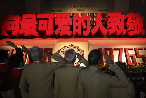 △2020年9月19日,在抗美援朝紀念館英烈廳,志愿軍老戰(zhàn)士和少先隊員向犧牲的烈士致敬。新華社記者 楊青 攝