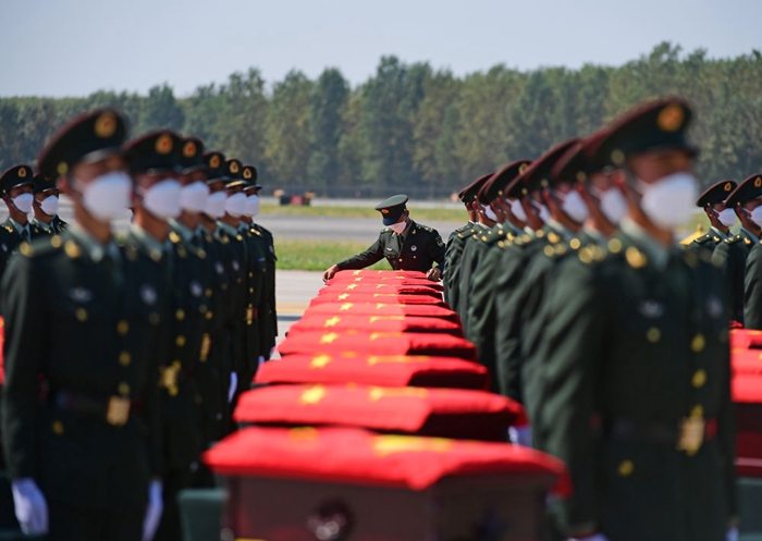 △2021年9月2日,在沈陽桃仙國際機場,禮兵在殮放志愿軍烈士遺骸的棺槨上覆蓋國旗。當(dāng)日,第八批在韓中國人民志愿軍烈士遺骸由我空軍專機護送從韓國接回遼寧沈陽,109位志愿軍烈士英靈及1226件相關(guān)遺物回到祖國懷抱。新華社記者 楊青 攝