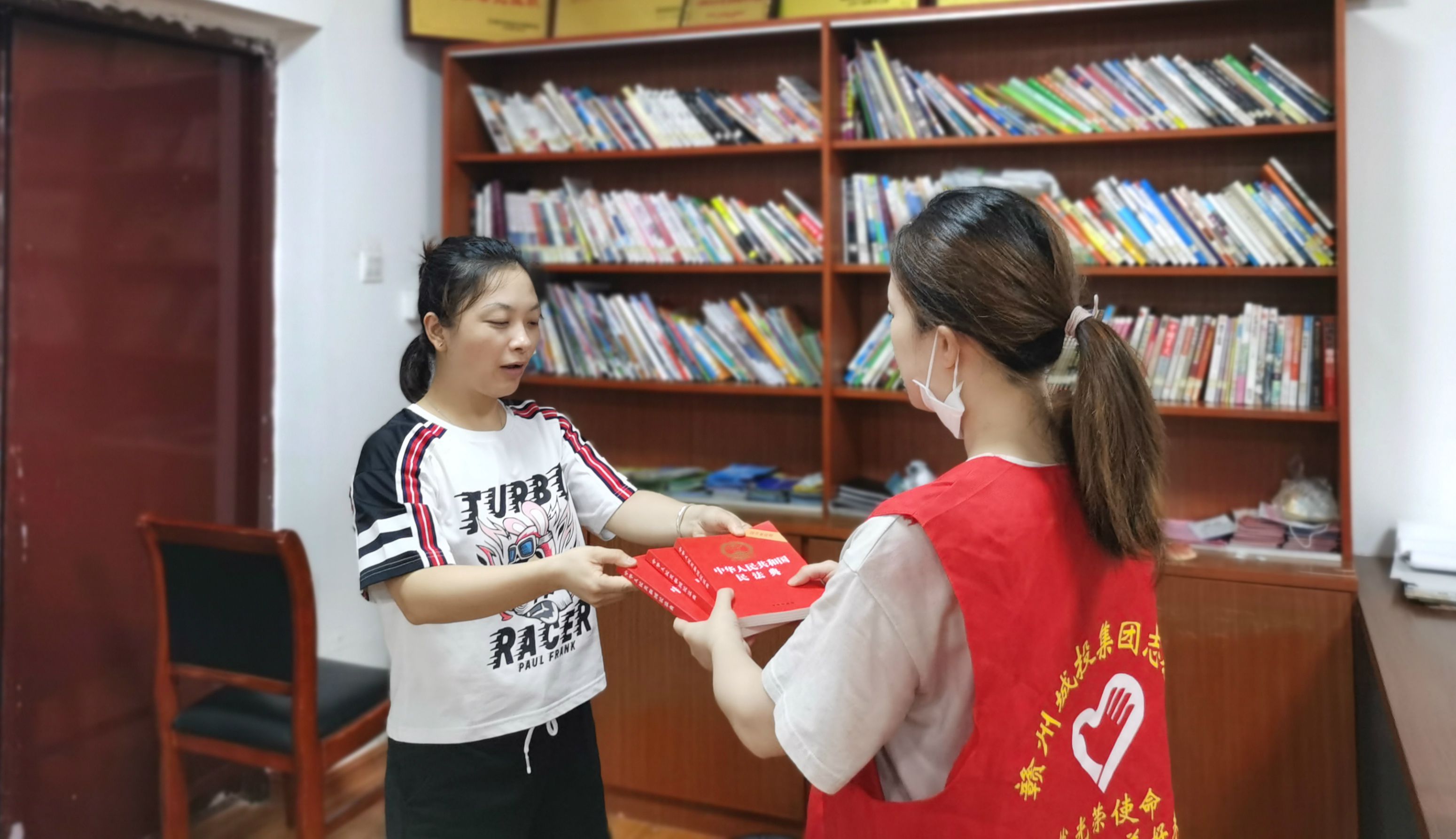 (上圖為7月9日贛州城投集團(tuán)志愿者為社區(qū)書(shū)屋捐贈(zèng)《民法典》)
