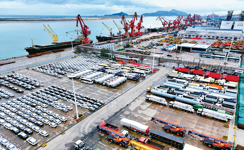 江蘇全面把握在全國開放格局中的發(fā)展定位,發(fā)揮“一帶一路”交匯點(diǎn)優(yōu)勢,聚焦建設(shè)具有世界聚合力的雙向開放樞紐的目標(biāo),加快推進(jìn)高水平對外開放,外貿(mào)進(jìn)出口總額連續(xù)多年居全國前列。圖為2024年10月18日,在江蘇省連云港東方港務(wù)分公司碼頭,大批國產(chǎn)車輛集港準(zhǔn)備裝船(無人機(jī)照片)。新華社發(fā) 王春/攝
